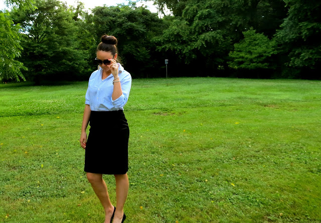 Outfit details: Skirt-J Crew Pencil, this one is similar; Shirt- Ralph Lauren oxford, seriously worth having one of these in just about every color; Shoes-Calvin Klein via TJ Maxx, these are similar; Sunnies- Urban Outfitters; Necklace-Tiffany & Co Keys